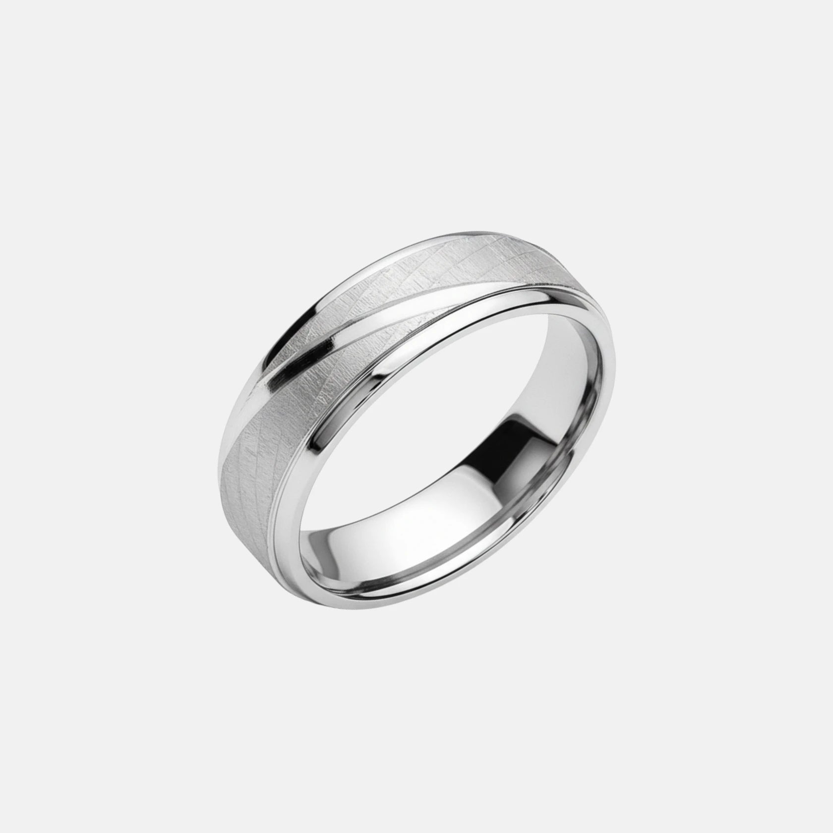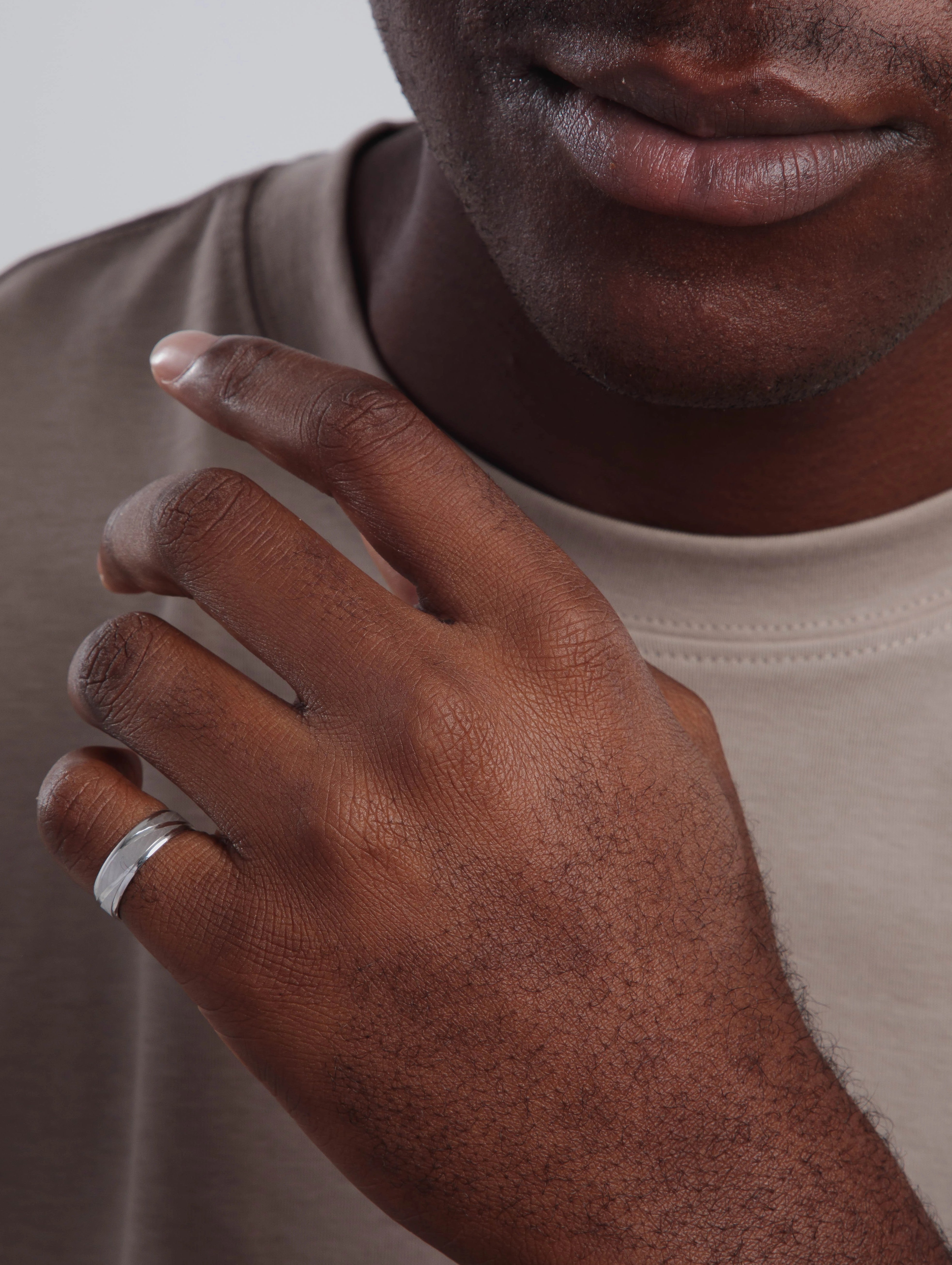 Diseño audaz que juega con texturas y acabados para crear un efecto visual impactante. Su banda ancha en plata 925 combina un fondo mate con un sutil patrón texturizado, atravesado por líneas pulidas en alto brillo que realzan su elegancia. Un anillo con carácter, perfecto para quienes buscan un estilo distintivo y moderno.