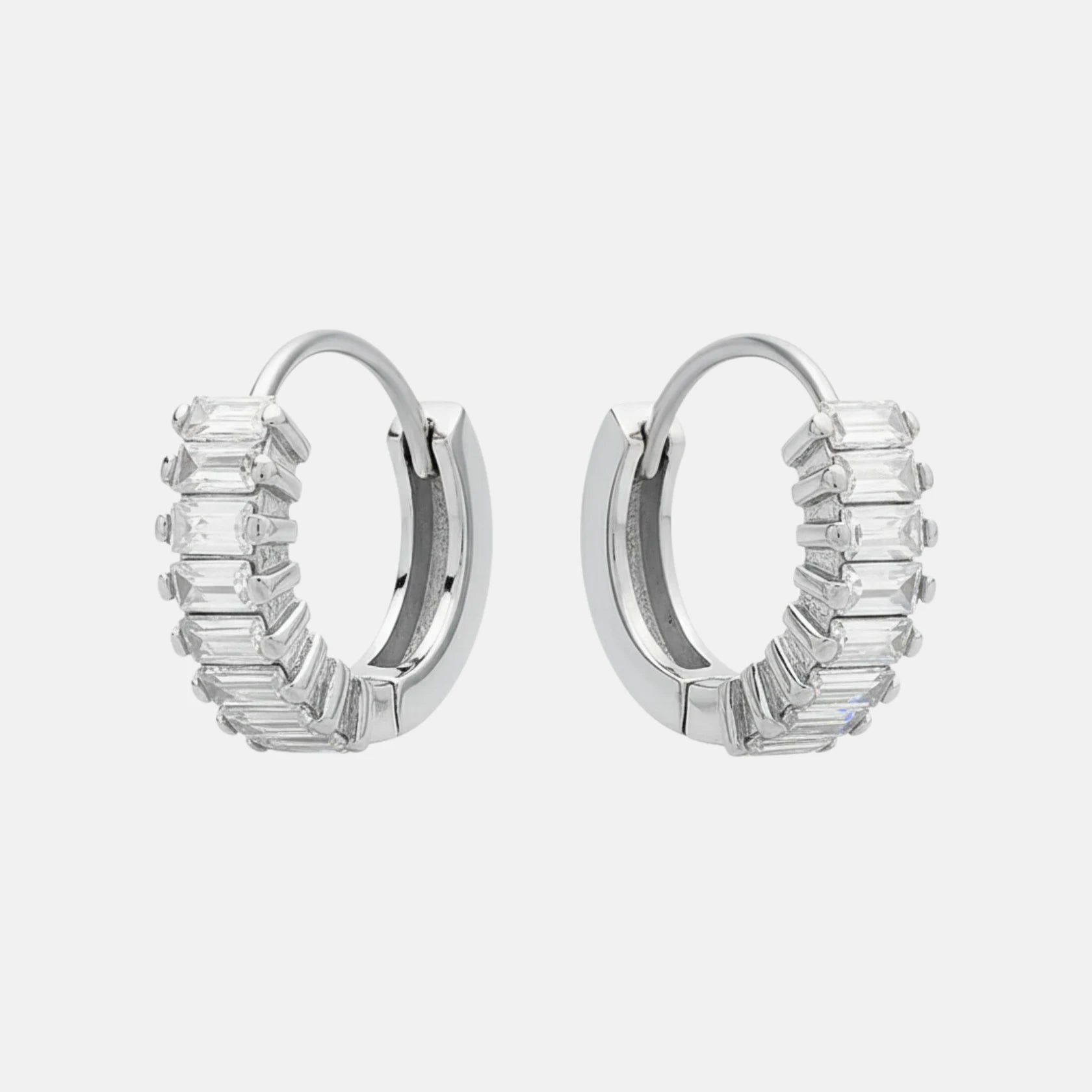 Los Aros Destello, un diseño sofisticado que refleja la luz en cada movimiento. Elaborados en plata 925, su estructura de aro clásico se realza con una hilera de circonitas baguette, creando un brillo deslumbrante y elegante. Perfectos para realzar cualquier look, desde lo cotidiano hasta las ocasiones más especiales.