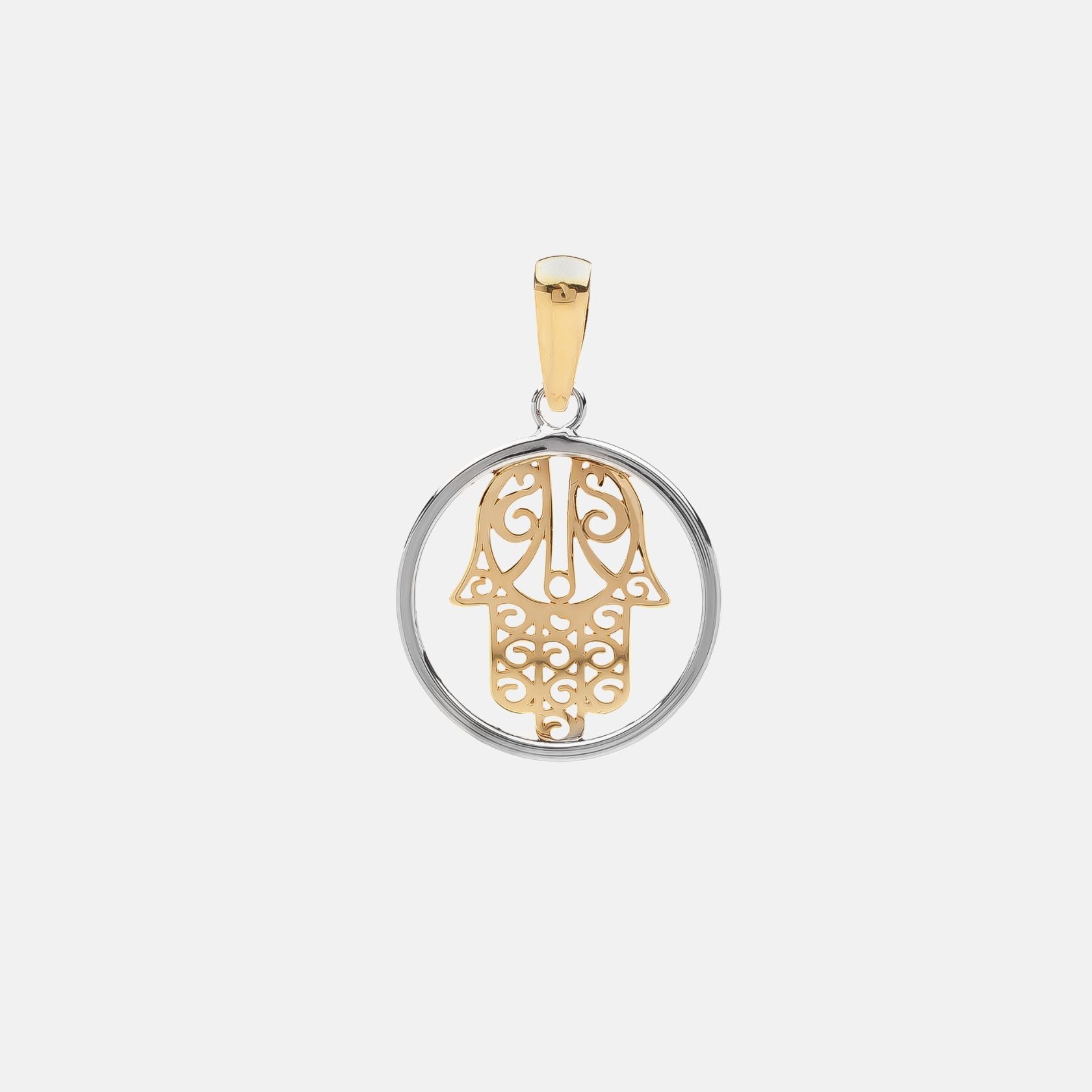 Un diseño lleno de misticismo y estilo, este colgante bicolor combina la calidez del oro amarillo con la elegancia del oro blanco, resaltando los detalles calados de la Mano de Fátima. Más que un accesorio, es un símbolo de protección y energía positiva