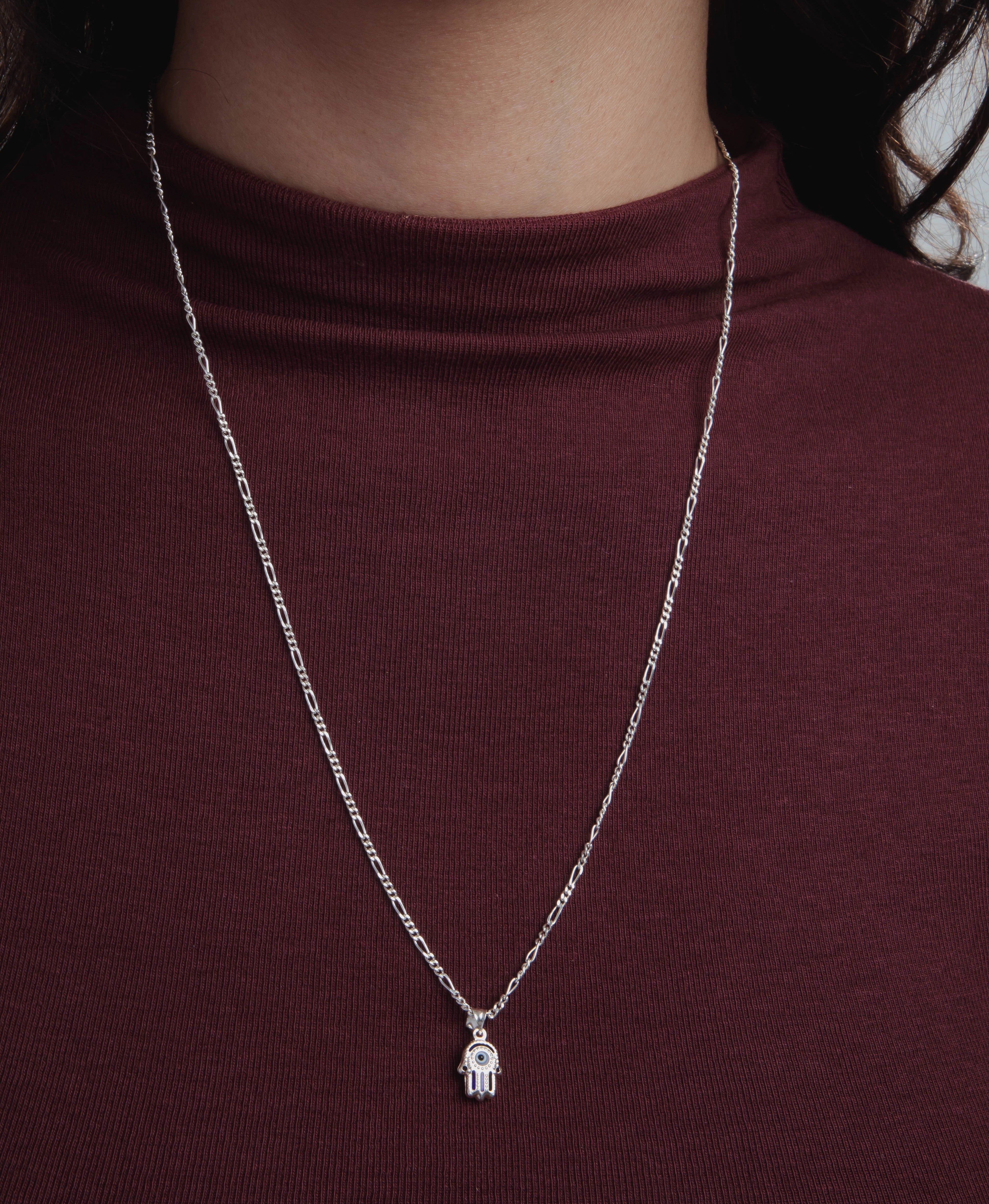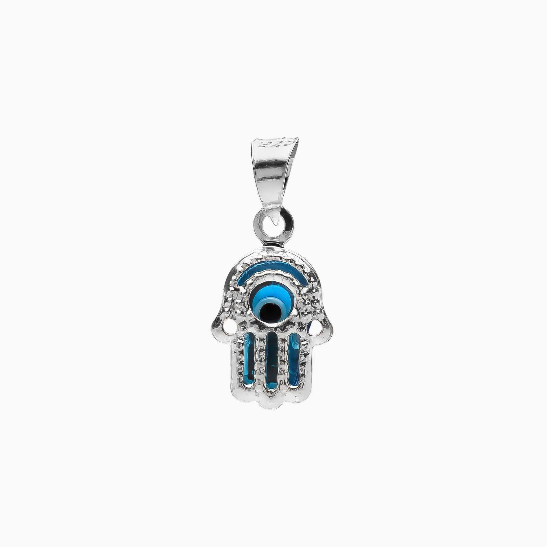 Un símbolo de protección y buena energía, este colgante de Mano de Fátima en plata 925 incorpora el tradicional Ojo Turco, que actúa como amuleto contra las malas vibras. Su diseño detallado con esmalte azul y acabado brillante lo convierte en un accesorio lleno de significado y estilo, ideal para llevar solo o combinado con otras piezas.