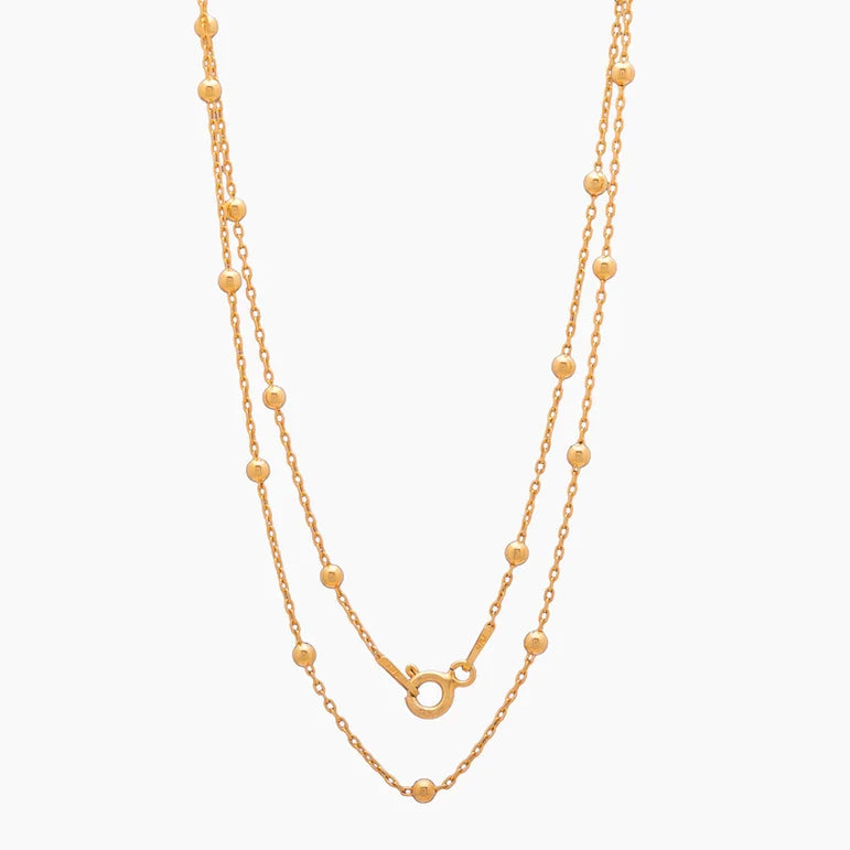 Este collar en baño de oro 18K presenta delicadas esferas intercaladas, creando un efecto de ligereza y movimiento. Perfecto para quienes buscan un accesorio versátil, ideal para llevar solo o combinar con otros collares para un look en tendencia. Su cierre resistente garantiza comodidad y seguridad en cada uso.