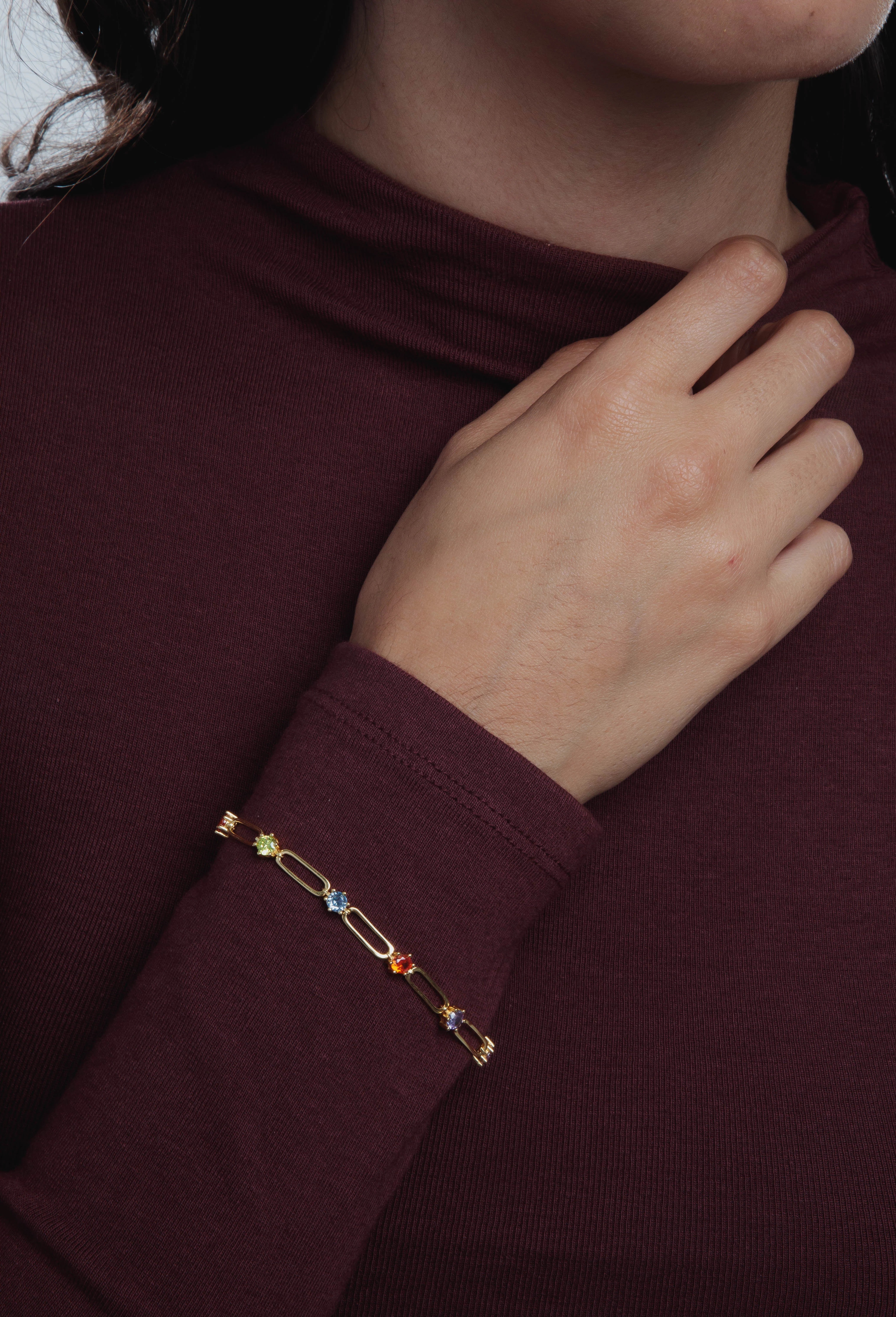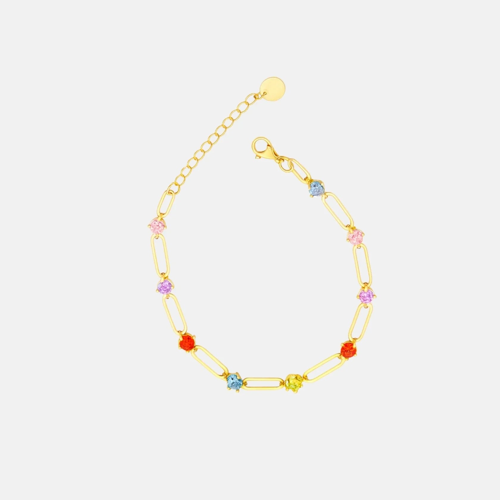 Una pulsera que trae buen humor de serie. Sus eslabones alargados en plata bañada en oro de 18 kt se mezclan con pequeñas circonitas de colores que parecen confeti colocado con mimo: tonos azules, rosas, verdes, naranjas; un arcoíris delicado que da alegría sin estridencias. El diseño es ligero y flexible, ideal para llevarla cada día y para combinarla con otras pulseras doradas. El cierre ajustable asegura que quede perfecta en la muñeca, siempre cómoda y siempre luminosa.