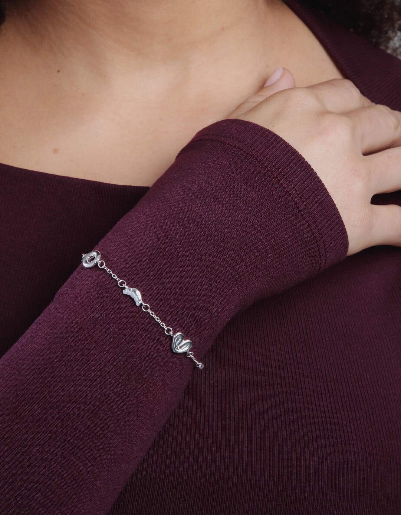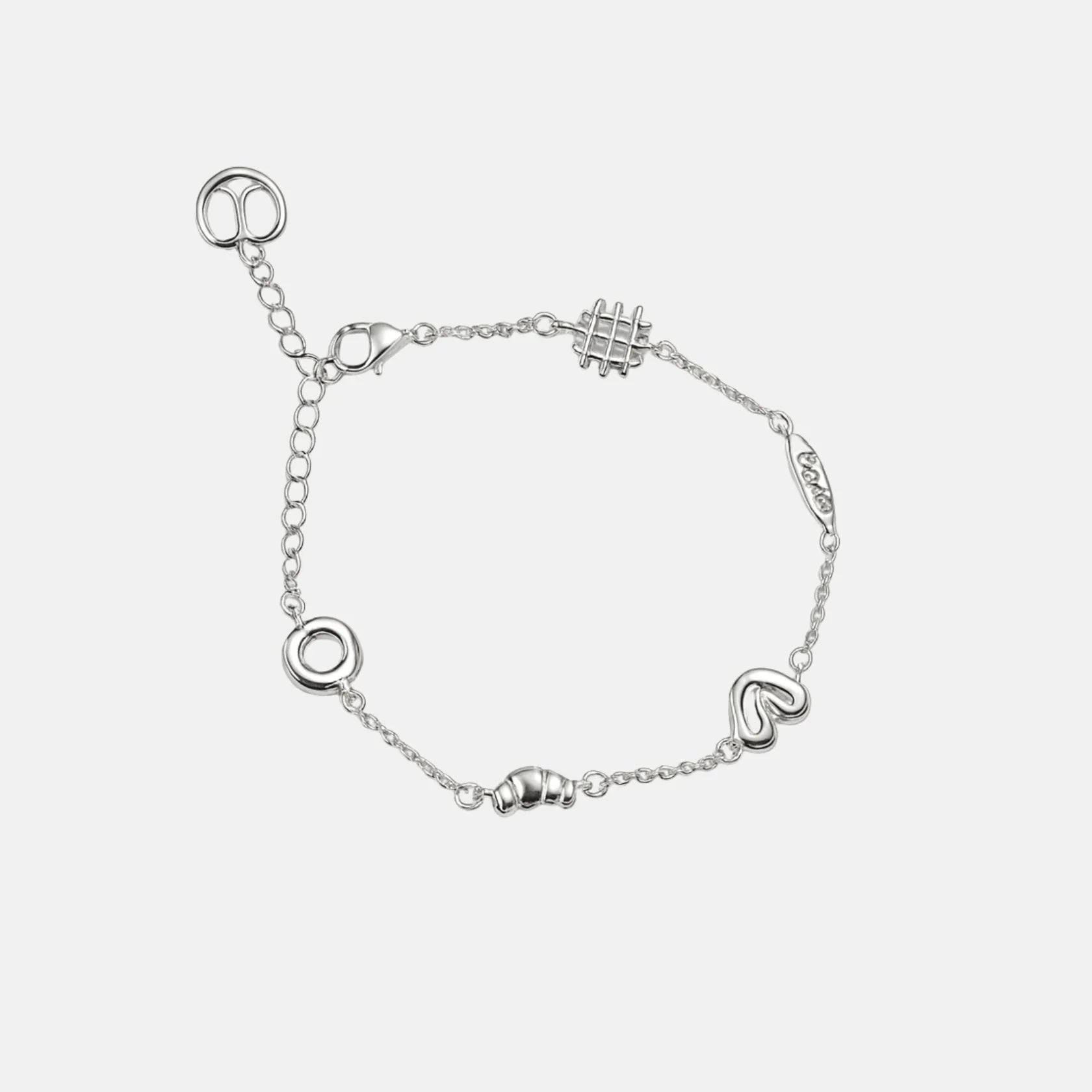 Una pulsera que mezcla formas como quien colecciona recuerdos. Cada pequeño símbolo, un corazón, un círculo, un gesto ondulado, un guiño geométrico, aporta un detalle distinto sin romper la armonía. La plata mantiene el diseño limpio y luminoso, creando un conjunto ligero que se siente muy actual. La cadena fina une todas las piezas como si fueran pequeñas historias conectadas, y el cierre ajustable la hace cómoda para el día a día. Es una pulsera que no sigue un único camino, y por eso conquista.