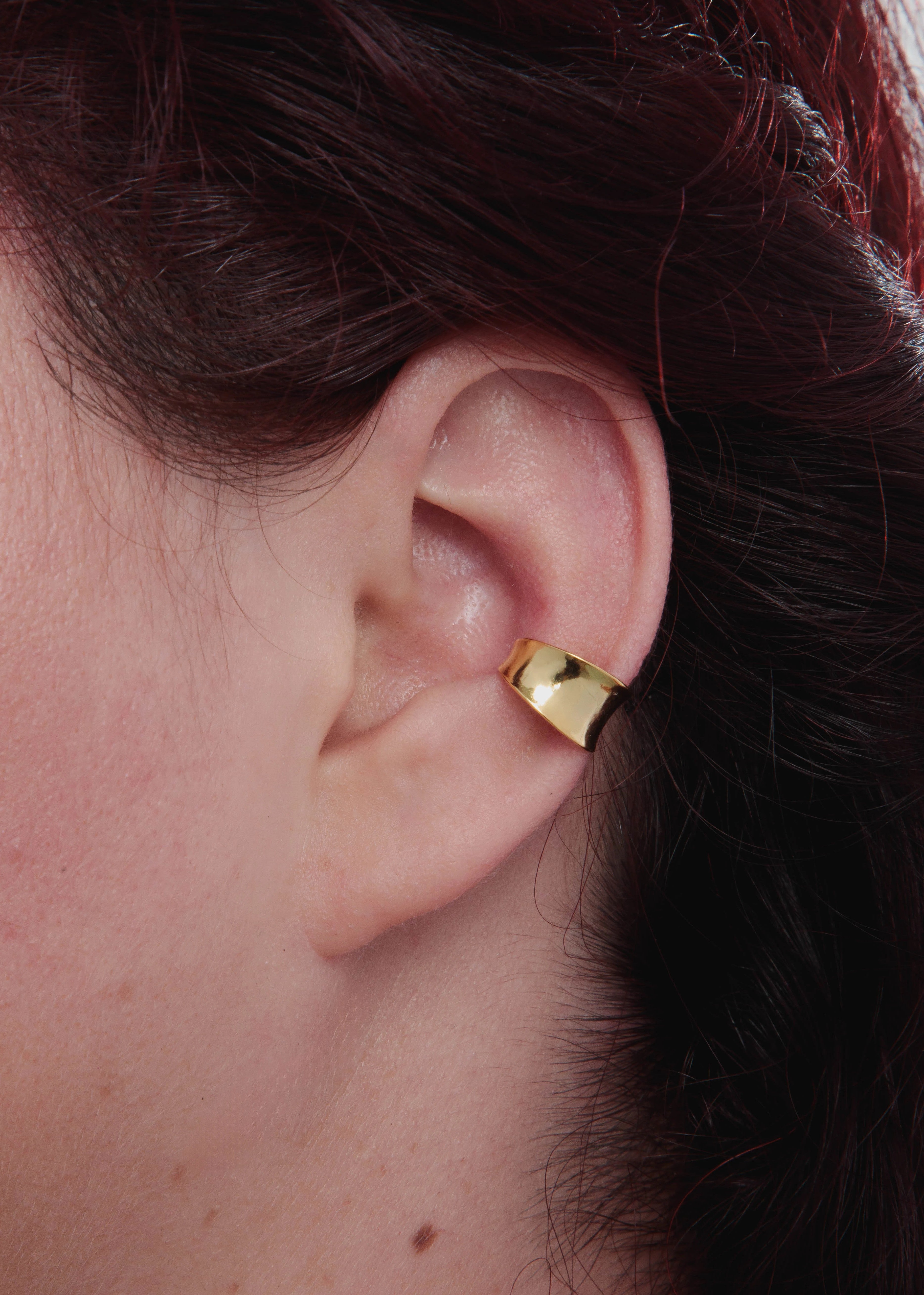 Un diseño imponente y minimalista que destaca por su estructura envolvente y acabado pulido en baño de oro. Su forma curvada se adapta cómodamente a la oreja, aportando un toque moderno y elegante sin necesidad de perforaciones. Perfecto para un look lleno de personalidad.