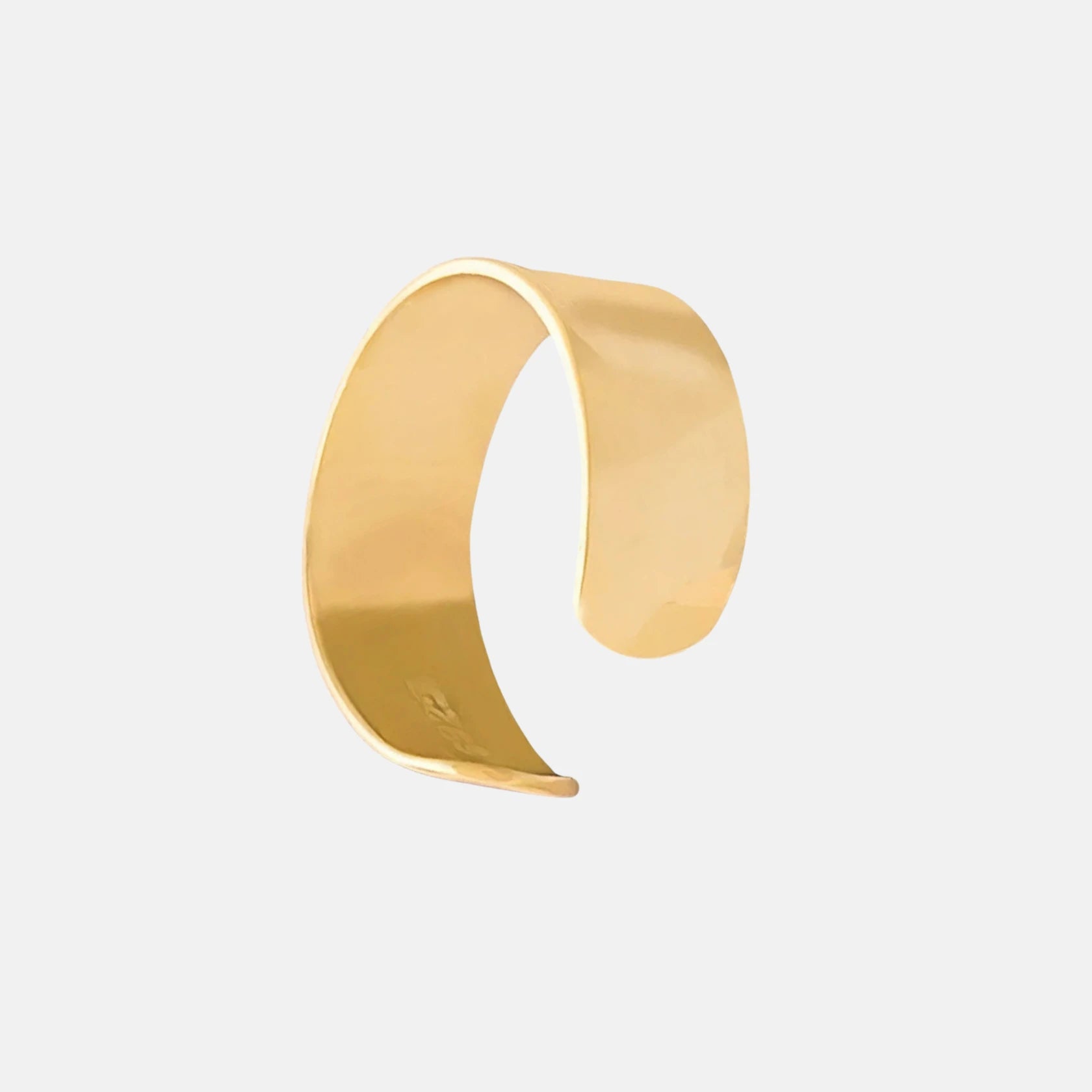 Este ear cuff envuelve la oreja con una forma fluida y definida, creando un efecto envolvente que resalta la silueta. Su acabado en plata 925 bañada en oro le da un brillo sutil, perfecto para quienes buscan una pieza con personalidad y carácter. Su diseño sin cierres permite llevarlo sin perforación, ajustándose cómodamente a la oreja.