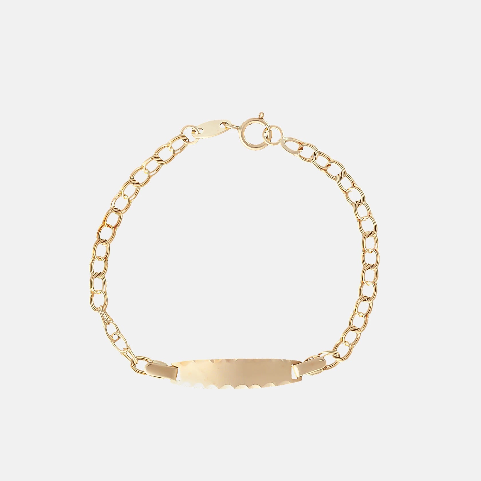 Delicada y elegante esclava de bebé en oro de 18 quilates, diseñada con una cadena de eslabones y una placa central con acabado satinado. Ideal para personalizar con un grabado especial, convirtiéndola en un regalo significativo para bautizos, nacimientos o primeras celebraciones.