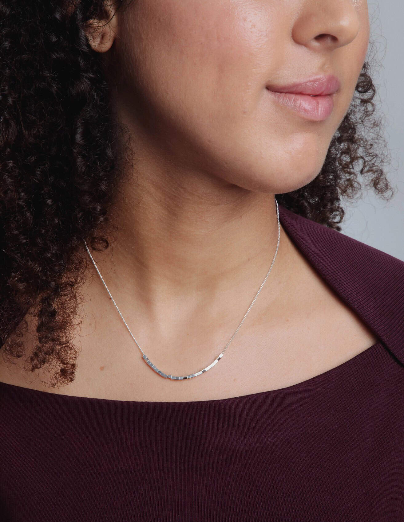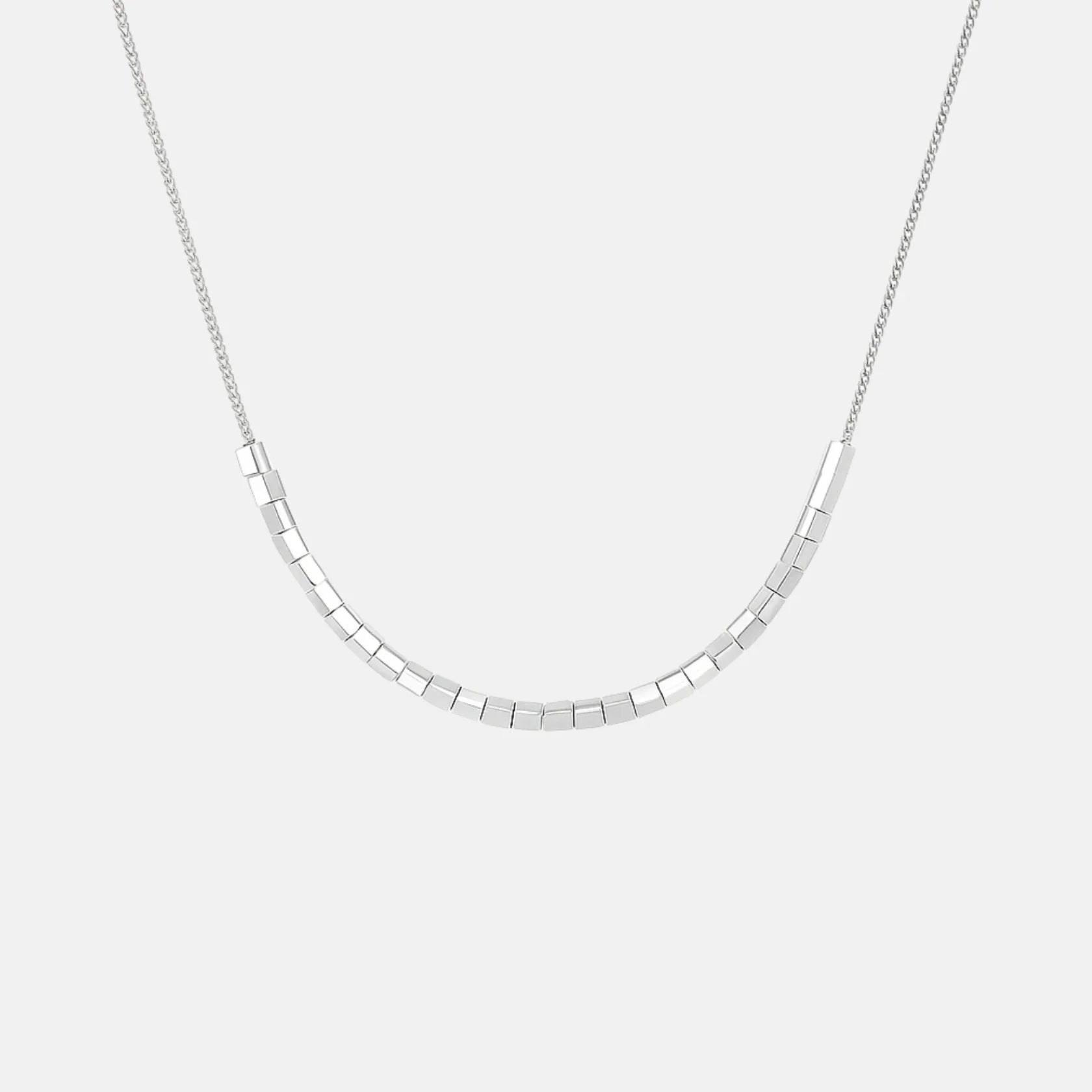 Un collar que habla de orden, líneas limpias y belleza sencilla. La parte central está formada por pequeños cubos de plata perfectamente alineados, creando una curva suave que se adapta al cuello con un gesto muy natural. El efecto es moderno, sutil y con una luz fría que realza cualquier look sin intentar robar protagonismo. La cadena fina prolonga esa estética minimalista y convierte la pieza en una opción ideal para llevar cada día, sola o combinada con otros collares. Es de esas joyas que transmiten calma y estilo a la vez.