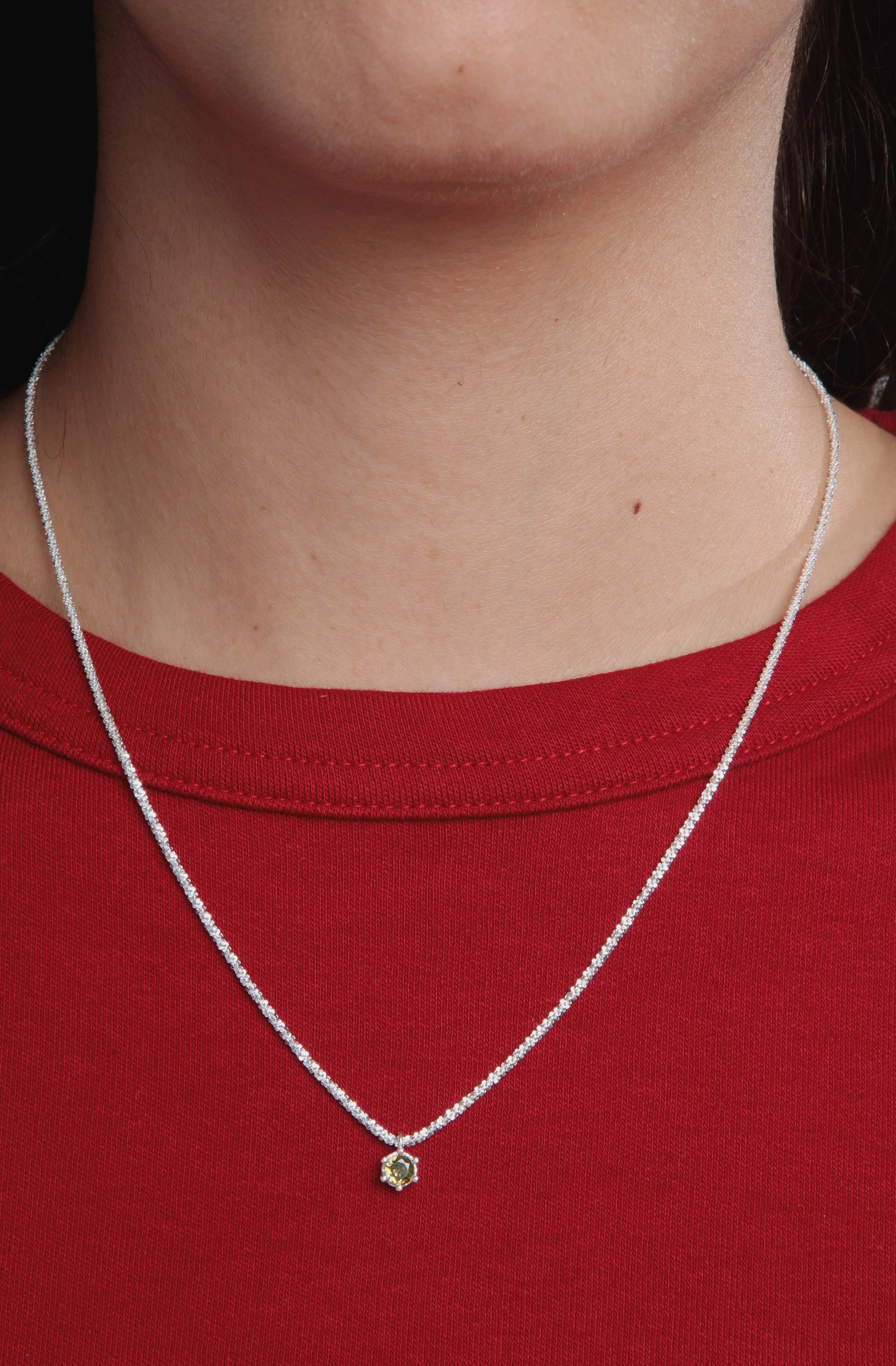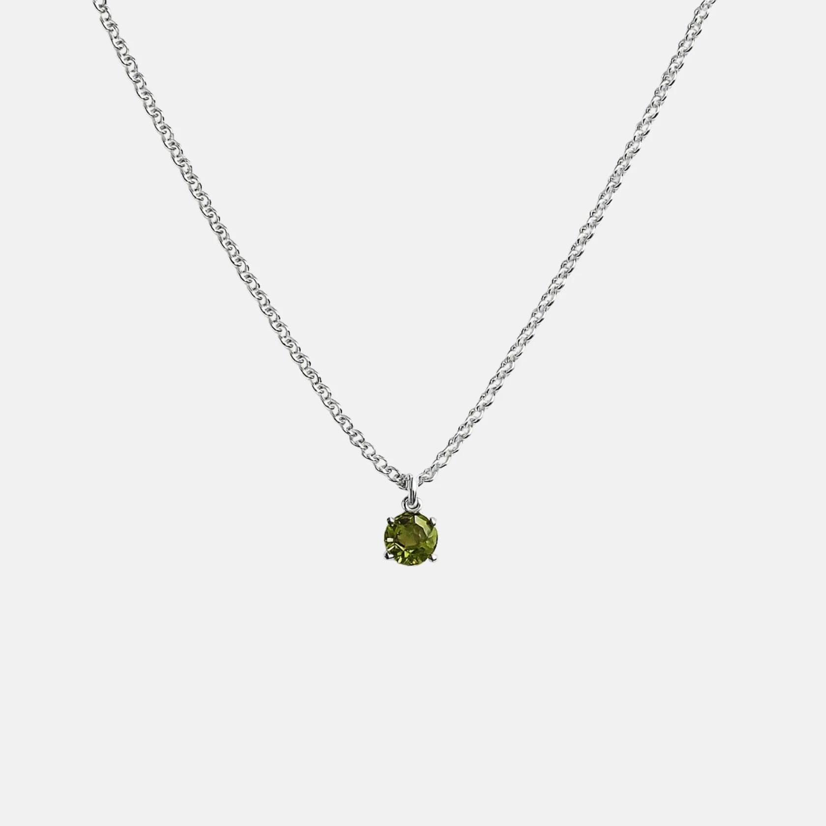 Un collar sencillo con un punto inesperado. La cadena fina en plata sostiene un solitario verde de corte redondo que aporta una chispa de color elegante y muy favorecedora. El tono de la piedra es vivo, moderno y perfecto para quienes buscan un detalle especial sin caer en lo llamativo. El engaste minimalista deja que la piedra sea la protagonista, creando un efecto limpio y luminoso que funciona igual de bien en el día a día o en un look más cuidado. Una pieza que no complica, pero sí transforma.