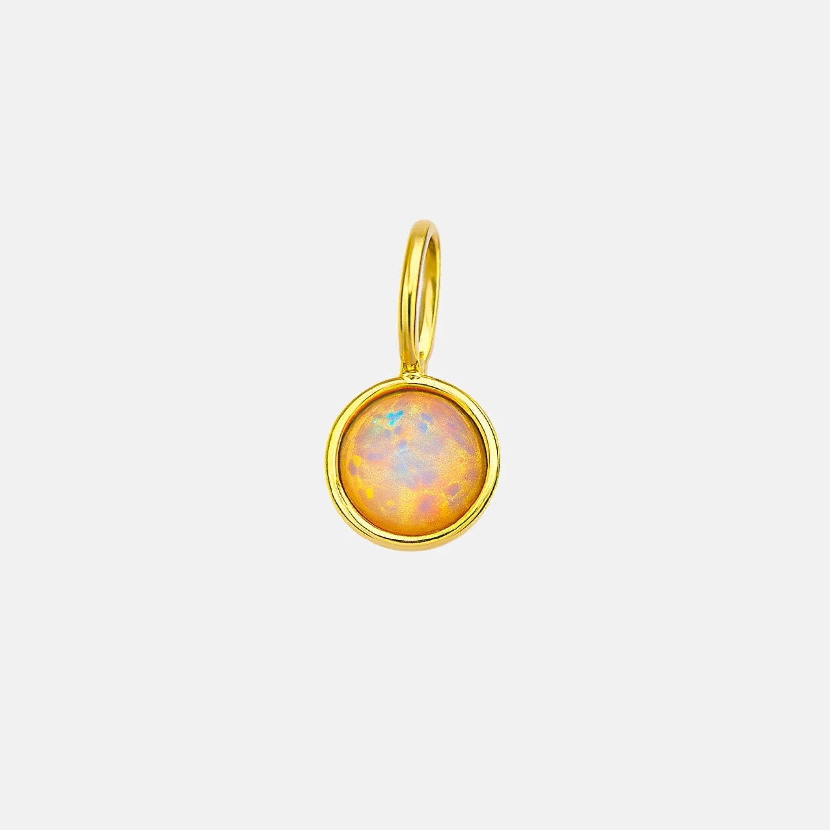 Un charm que parece guardar un pequeño atardecer dentro. Su piedra en tono melocotón revela destellos rosados, dorados y azulados que cambian con el movimiento, creando un efecto casi hipnótico. El borde en plata bañada en oro de 18 kt enmarca la pieza con suavidad y aporta un toque cálido que la hace aún más especial. Es un charm perfecto para quienes buscan una nota de color elegante, algo distinto a lo habitual pero igual de fácil de llevar. Funciona increíble en cadenas cortas, combinaciones de charms o como punto focal en una pulsera fina.