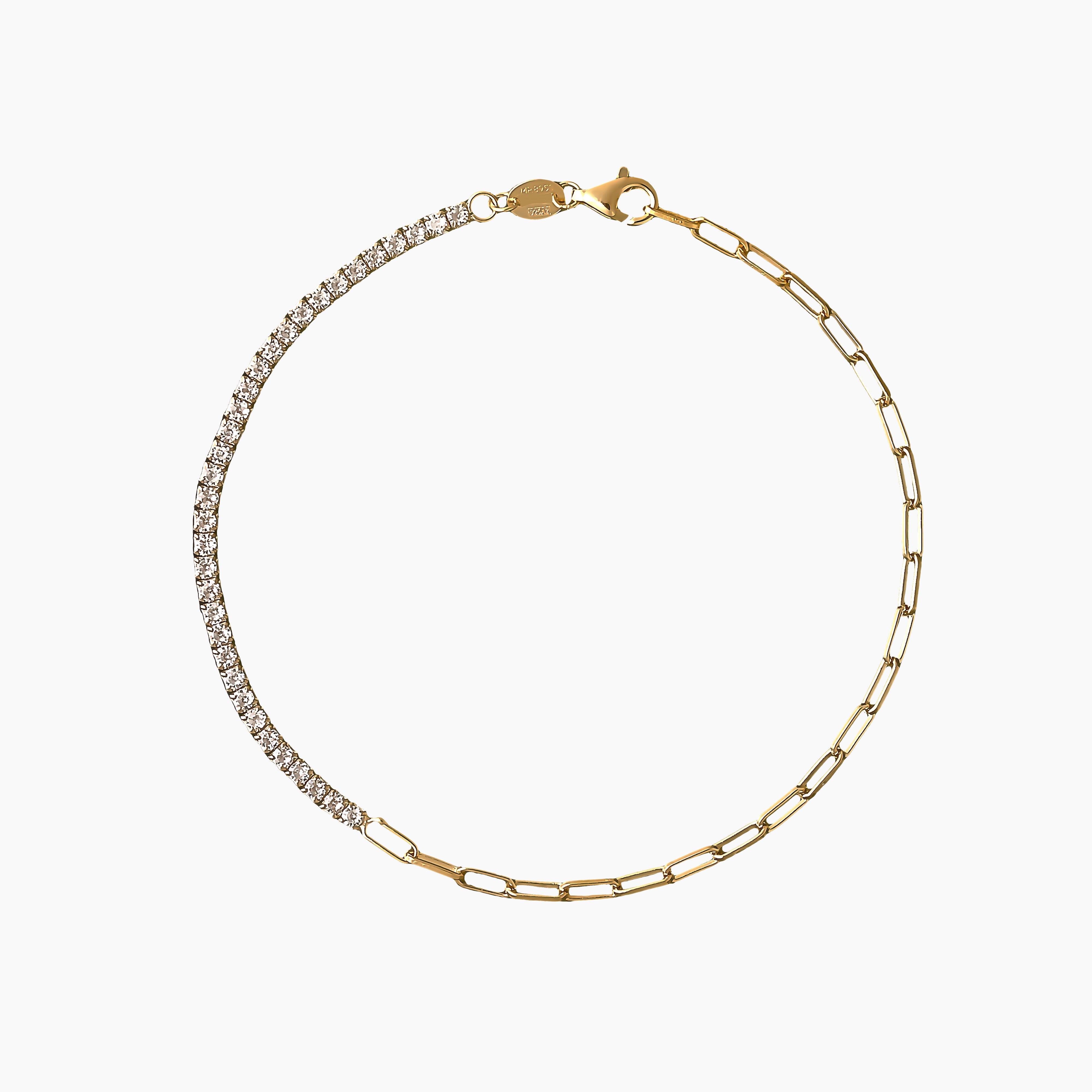 Esta pulsera en chapado de oro combina una mitad de circonitas resplandecientes con eslabones alargados, creando un diseño moderno y sofisticado. Ideal para realzar cualquier look con un equilibrio entre lujo y sencillez, perfecta para llevar sola o en capas con otras pulseras.