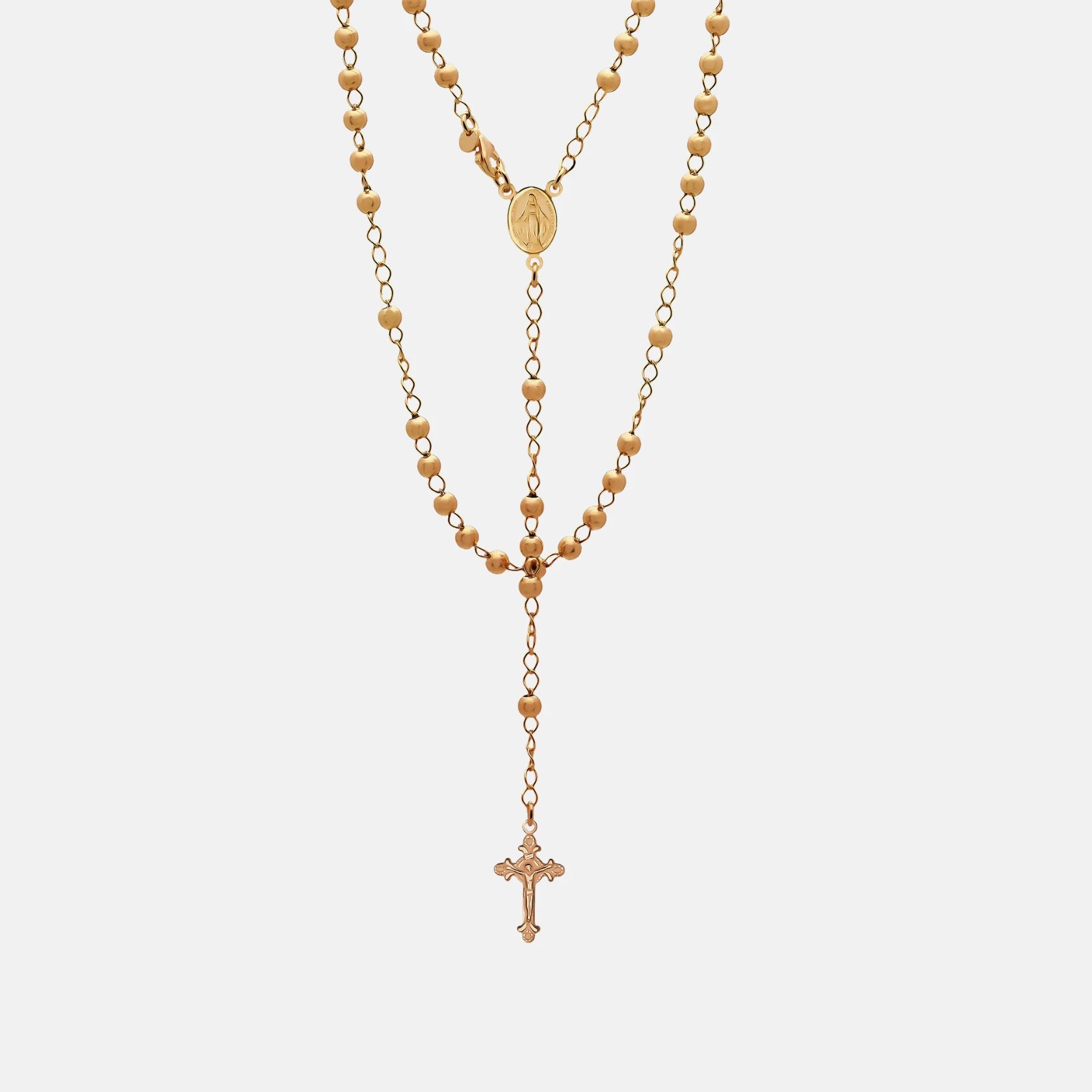 Un diseño clásico con un toque de lujo. Este rosario en plata 925 con baño de oro de 18K combina elegancia y significado, con cuentas pulidas y detalles grabados que realzan su belleza. La cruz y la medalla central aportan un acabado sofisticado a esta pieza atemporal.
